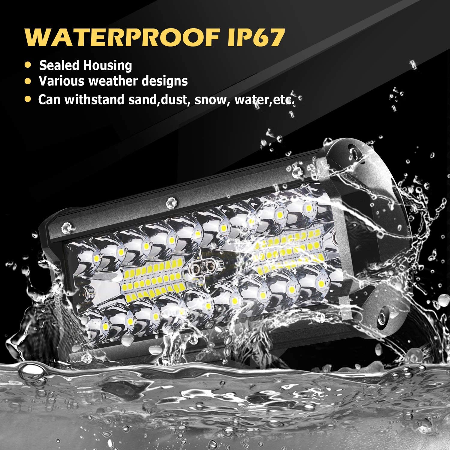 IP68 Waterproof Test: Die cast aluminum housing as the first protection and the waterproof rubber pad as the second protection. And we added two more screws to improve the waterproof performance. We put the light bar submerged in one meter of water for 5 hours and they still work great underwater. No matter it's stormy, rainy or snowy, start your journey of off-roading!