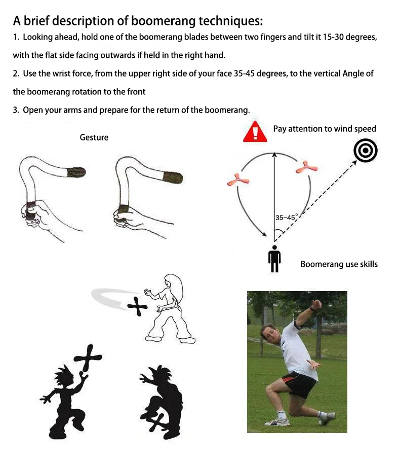 2. Use the wrist force, from the upper right side of your face 35-45 degrees, to the vertical Angle of the boomerang rotation to the front.