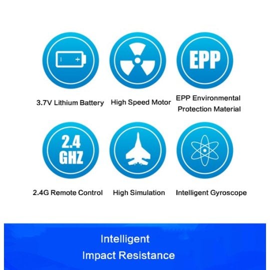 - 2.4GHz 2CH aircraft, including 4 directional flyings, ascending, descending, turning left, and turning right.